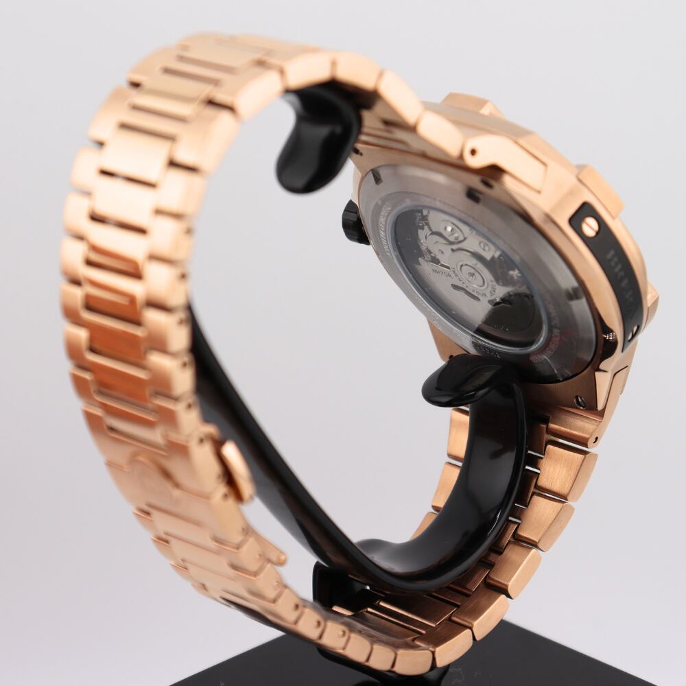 また、裏面がスケルトン設計になっているため、時計の心臓部であるムーブメントの精緻な動きを楽しむことができ、機械式時計ならではの魅力を感じられます。