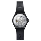また、裏面がスケルトン設計になっているため、時計の心臓部であるムーブメントの精緻な動きを楽しむことができ、機械式時計ならではの魅力を感じられます。